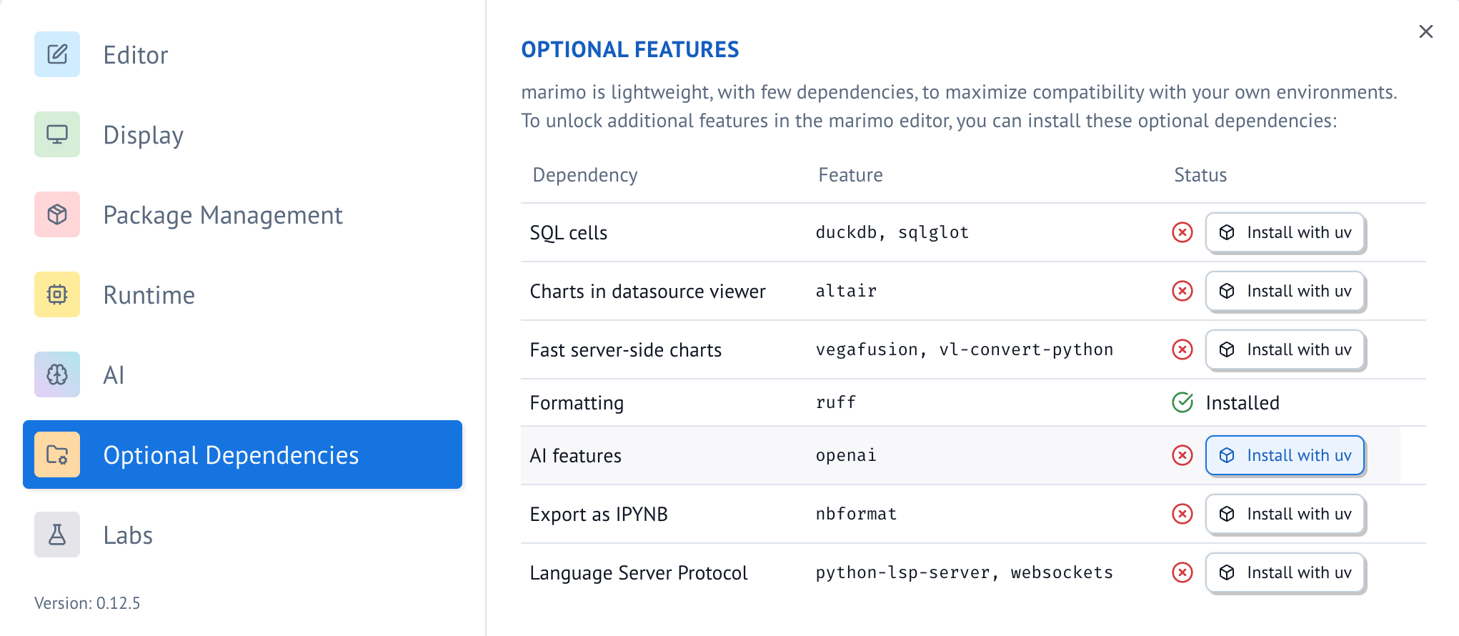 Various instructions in this guide refer to the marimo.toml configuration file. Locate this file with marimo config show | head.